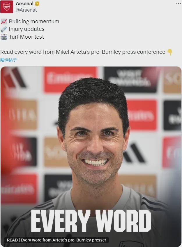 本赛季对伯恩利的比赛之前,阿森纳在英超客战打进的4个进球全部来自角球。(这场第一个进球也是角球,也就是说本赛季5个英超客场进球全部是角球)什么任意球队、角球队、长距离手抛球队……随便他们喊,反正只要明年枪迷喊冠军就行!希望对伯恩利的比赛,阿森纳能打进本赛季客场的第一个运动战进球吧!反正第一个角球是先来了……电讯报统计,自从赖斯于2024年1月份开始主罚任意球开始,他已经成为了欧洲最好的定位球手,并且期间在英超已经贡献了10个定位球助攻,助攻数是其他任何英超球员的2倍以上,并且比任何其他五大联赛的球员都多。赖斯的定位球还真挺好,经常能看到他定位球(尤其是角球)助攻,没想到光是英超就10个了……所以我说赖斯、萨卡和加布(本场比赛又是加布参与了第一球)是阿森纳定位球战术的关键,光有战术安排不够,你还得有靠谱的人执行,赖斯的角球和前场定位球找人相当靠谱!而且还有对皇马的2脚直接任意球世界波!多给他罚几次直接任意球说不定进球更多。赖斯在各方面都十分有战术价值,太全面了,所以说他其实是中场真正不可或缺的人,别的位置都是双保险,但赖斯受伤的话,他的作用无人可替。阿尔特塔在赛前新闻发布会上谈到了球队的伤病问题,咱们简单看看阿森纳主帅的发言。关于新的伤病消息:没有,我认为情况和之前一样,马丁内利依然缺阵,萨利巴的情况要等等看(结果是本场比赛首发登场)。其余的人正逐渐接近复出,但还不能登场。那么马丁内利什么时候能复出呢?我们还不知道,但我认为对伯恩利的比赛对他来说还是太早了。哈弗茨、马杜埃凯、厄德高和热苏斯什么时候能复出?还要几周时间,他们中的几个人可能很快就能回来,希望如此吧,假如他们能继续像这样进步。很难说哪场比赛可以复出,你懂的,还有国际比赛日,这有2周时间,而在这之后,我认为有几名球员可以回来。我不知道届时是否所有人都能复出,但到时候肯定非常接近了。那么你希望哈弗茨、马杜埃凯和厄德高能及时赶上北伦敦德比吗?是的,我很激动,因为他们都是非凡的球员,我每天都看着他们工作,他们非常渴望回到球队。能迎回这些球员对球队来讲是巨大的鼓舞,我很开心,因为我认为真的很接近了。因为时间原因,大家看到消息时比赛已经开始甚至结束了,所以就别说太多了。伤病的话,小马丁依然缺阵,但至今不清楚他是什么伤,也没有相关报道;阿尔特塔赛前说不确定萨利巴能否出战,但首发阵容已经公布,萨利巴首发,他没事。中期伤病方面,厄德高、马杜埃凯和哈弗茨是有望在国际比赛日后对热刺的比赛中复出的,当然能不能直接进首发很难说,但至少届时问题不大了。热苏斯比较特别一些,他现在其实已经恢复了室外的有球训练,但恐怕还是要到12月中旬之后才有希望复出。耐心等待吧,这个赛季的阵容非常厚实,基本上能应对任何情况。罗马诺消息,拉姆塞已经和墨西哥美洲狮提前解约,他在离队后再次成为了自由球员。拉姆塞加盟墨西哥美洲狮以来出战6场比赛,打进1球。据说这次解约与拉姆塞的宠物狗“光环”在墨西哥寄养后失踪有关……最近确实在社交媒体上看到拉姆塞各种发寻狗启示,而且还设置了1.3万英镑的赏金,但至今爱犬杳无音信……有报道说爱犬丢失后拉神连续缺席了训练,美洲狮无法忍受,所以提前解约,拉神可以回威尔士疗愈一下创伤。在墨西哥,人失踪可能都不算啥新闻,别说狗了,哎,着实离谱,寄养还能丢失……世界体育报消息,阿森纳和曼联都有意收购莱万特前锋卡尔-埃塔-埃永。22岁的埃永本赛季表现出色,他已经代表莱万特在10场西甲比赛中贡献6球3助攻,报道称皇马和巴萨甚至也在关注这名前锋。根据西媒的说法,曼联和阿森纳需要支付4000万欧元签下埃永,而西甲球队只需要3000万欧元就能完成交易。可能性不大,也不是可靠传闻。哪怕热苏斯明年离队,中锋位置有哲凯赖什和哈弗茨,再加上青训前锋,也差不多够了,再花大钱买中锋不太可能,除非卖掉哈弗茨,但我认为哈弗茨依然是阿尔特塔计划中的重要球员。先看比赛吧!