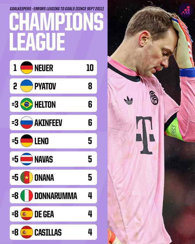 北京时间11月27日,在欧冠联赛阶段第5轮拜仁慕尼黑客场与阿森纳的比赛中,诺伊尔第77分钟出击失误导致丢球,最终拜仁也在酋长球场1-3吃到了本赛季的第一场败仗。赛后,知名数据机构Opta统计出了自2011年以来欧冠比赛门将失误导致丢球的排行榜,诺伊尔10次排名第一,莱诺、纳瓦斯、奥纳纳、多纳鲁马、德赫亚以及卡西利亚斯上榜。Opta统计2011年以来欧冠门将失误丢球榜:1. 诺伊尔 10次2. 皮亚托夫 8次3. 埃尔通 6次3. 阿金费耶夫 6次5. 莱诺 5次5. 纳瓦斯 5次5. 奥纳纳 5次8. 多纳鲁马 4次8. 德赫亚 4次8. 卡西利亚斯 4次【上咪咕独家看英超】