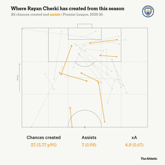 人们常指责佩普-瓜迪奥拉将其最具天赋的攻击手身上的灵动与才华“训练殆尽”,无情地固守一套优先考虑集体控制、而非个人闪光时刻的体系。但在上周六他的曼城2-1战胜诺丁汉森林,取得英超六连胜并登上榜首(直到当天晚些时候阿森纳击败布莱顿)的比赛中,他必须感谢谢尔基那自由奔放的足球灵气。“有些时刻我只想朝他大喊,”瓜迪奥拉赛后带着苦笑说道,“而有些时刻我想亲吻他。”后一种冲动,出现在这位法国球员贡献一传一射,击溃森林队顽强抵抗,并在比赛尾声以曼城球迷早已习以为常的完美技术轰入关键制胜球之后。如果说他在媒体前的倾倒之态还不够说明问题,那么瓜迪奥拉战术安排中日益增多的证据表明,连他也已然沉醉于谢尔基那如行云流水般的艺术足球,自从十一月初3-1战胜伯恩茅斯(当时他首次安排谢尔基与福登联袂首发)以来,瓜迪奥拉几乎再未变动过英超首发阵容,着重于用能与谢尔基进行配合的技术型球员来围绕这位22岁的年轻人。“我必须允许他展现自己不可思议的天赋,”这位曼城主帅说道,“上半场,我们有太多球员留在球后面,而在前场肋部区域的人则较少。”这或许是瓜迪奥拉迄今为止最清晰地表达了他对谢尔基在面对密集防守球队时所展现的即兴创造力的欣赏,也表明主帅正在尽其所能培育这种直觉性的、在紧逼下的细腻配合。这对通常坚持在进攻三区执行既定套路的瓜迪奥拉而言,是一个微妙的转变。但谢尔基正在帮助瓜迪奥拉的球队赢得那些即使是他此前那支无往不胜的队伍也可能无法拿下的比赛。谢尔基在进攻三区送出犀利传球的惊人能力,源于他左右脚皆精的非凡技术。但他移动皮球的方式同样精妙,经常通过加速、减速以及用脚的各个部位进行微小触球来左右晃动,意在打乱防守者的平衡。他在比赛第20分钟创造了曼城的首次机会,用脚外侧旋出一记传球,让哈兰德得以完成一脚凌空抽射;两分钟后,他又几乎用一记插传为挪威人送出单刀,虽被拦截,但谢尔基等待的正是内科-威廉姆斯将身体重心移向封堵内线传球路线的确切瞬间,然后才尝试走外线,迫使这位边后卫急忙转身,做出一次惊险的封堵才阻止了皮球穿透防线。谢尔基在进攻三区许多有威胁的传球都为接球者创造了直接起脚射门的空间,这绝非巧合。他在传入禁区的传球力度和角度上总是经过考量,常常以快速的插传令防守者措手不及,呆立原地。上半场稍晚,他用一记撕裂防线的直塞球找到了空当中的蒂贾尼-赖因德斯。他先将球轻轻向前推,吸引防守球员靠近,等待空当出现,然后才将球从对手伸出的腿旁塞过。尽管单看这并非一次高难度传球,但它有助于说明预判谢尔基的困难。他的技术能力使他能够在球处于任何位置——脚下、右侧或左侧——时都能挖出传球线路,而不暴露其意图。在比赛的大部分时间里,瓜迪奥拉的球队难以在森林队紧凑的4-5-1阵型线条之间找到空当,因为摩根-吉布斯-怀特回撤中场,确保了曼城的后卫无法将球穿透性传出。但正是在这样的比赛中,谢尔基的“开锁”技巧得以凸显,他也在下半场初段适时地送出了本赛季第七次助攻,激活了比赛。这粒进球植根于默契,关乎本能与快速思考。当谢尔基在一个肋部空当接到传球时,哈兰德立刻试图挤入禁区,将中卫穆里略带向后门柱。这为赖因德斯的前插进攻拉开了空间,而这次跑动被谢尔基瞬间察觉。又一次,传球的力度和角度完美无缺,让荷兰人得以第一时间完成终结。比赛在双方都寻求绝杀时变得更加开放,而快节奏似乎正适合谢尔基在狭小空间内掌控节奏的能力。在他打入戏剧性制胜球之前,他几乎再次贡献助攻:在一次涉及贝尔纳多-席尔瓦和福登的流畅配合后,他将挑到身后的球勾回控制,随后一记挑传送入禁区,找到福登的跑动路线。毫不意外,谢尔基在英超创造了最多机会、直塞球、预期助攻值以及每90分钟助攻数,其创造力分布图(见下文)突显了众多他可以将球送入禁区的通道。