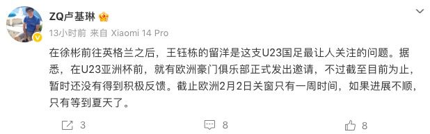 北京时间1月31日,来自知名媒体人、原《足球报》记者卢基琳透露,U23亚洲杯开赛前,有欧洲豪门俱乐部向王钰栋发出正式邀请,但目前还没有得到积极反馈。